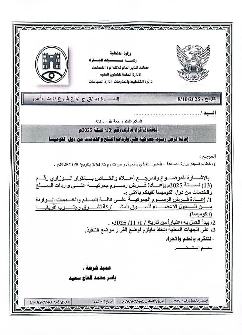 اعادت سلطات الجمارك السودانية فرض رسوم جمركية على كافة السلع والخدمات الواردة من الدول الأعضاء للسوق المشتركة لشرق وجنوب أفريقيا “الكوميسا”.