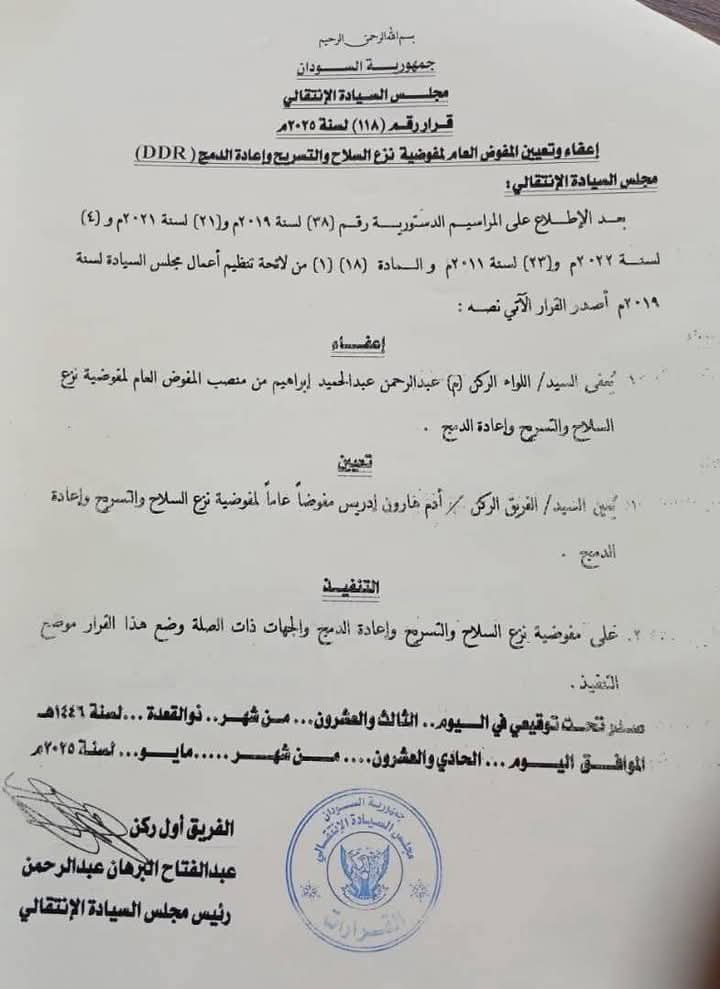 أصدر رئيس مجلس السيادة الفريق أول ركن عبدالفتاح البرهان قرارا بتعيين الفريق آدم هارون مفوضا عاما لمفوضية نزع السلاح والتسريح وإعادة الدمج بعد اعفاء اللواء ركن عبدالرحمن عبدالمجيد من المنصب.