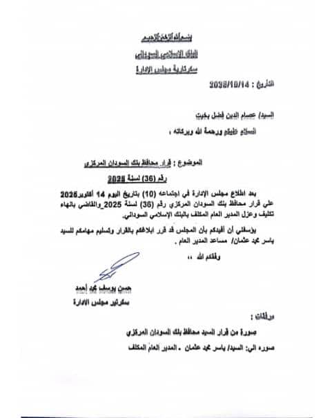 حصلت (الأحداث) على قرار صادر من مجلس إدارة البنك الإسلامي السوداني، أبلغ فيه مدير عام البنك عصام فضل بخيت بقرار محافظ بنك السودان المركزي بإعفائه من إدارة البنك والعمل المصرفي .
