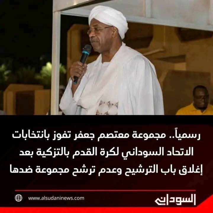 فازت مجموعة التطوير بقيادة د. معتصم جعفر بانتخابات الاتحاد السوداني لكرة القدم بالتزكية بعد إغلاق اللجنة، الثلاثاء، لباب الترشيح الثلاثاء.