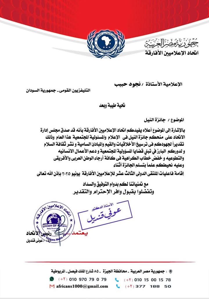 منح اتحاد الاعلاميين الأفارقة المذيعة نجود حبيب جائزة (النيل) لدورها الإعلامي في ترسيخ القيم وأخلاقيات المهنة وتبني قضايا المسؤولية المجتمعية.