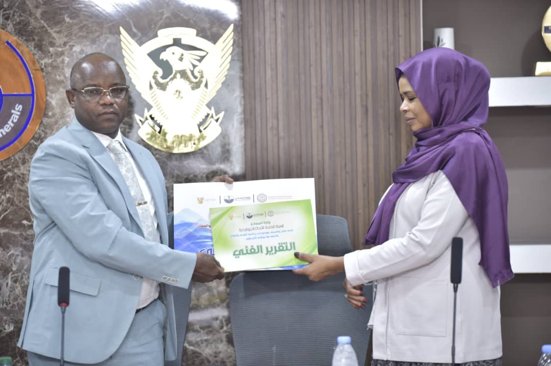 تسلّمت وكيل وزارة المعادن د. هند صديق ، الأحد، تقرير لجنة حصر وتصنيف موجودات الهيئة العامة للأبحاث الجيولوجية والمقار التابعة لها بولاية الخرطوم، من المدير العام للهيئة، جيولوجي مستشار أحمد هارون التوم، وذلك بمقر الوزارة المؤقت بالعاصمة الإدارية بورتسودان.