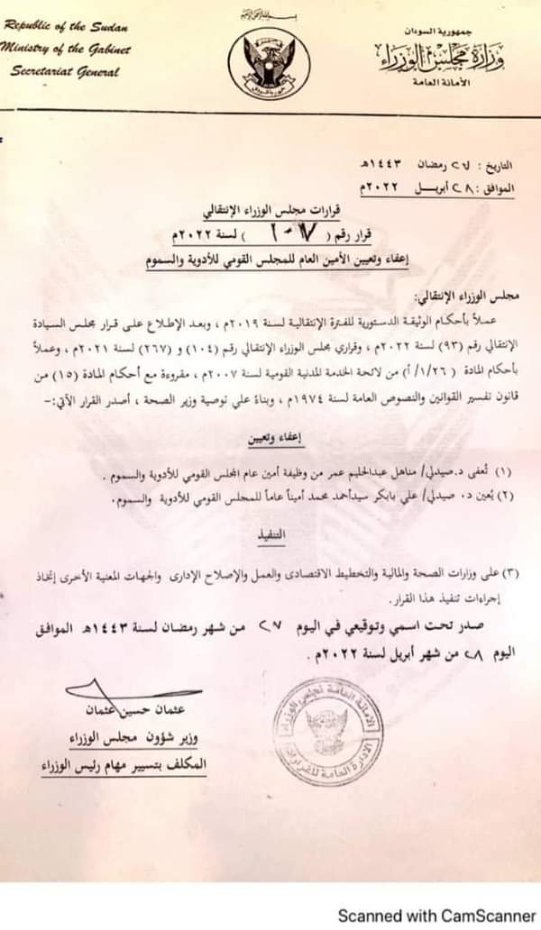 أصدر وزير شؤون مجلس الوزراء عثمان حسن عثمان ، قراراً بإعفاء د.صيدلي مناهل محمد عبدالحليم من وظيفة الأمين العام للمجلس القومي للأدوية والسموم وتعيين د.صيدلي علي بابكر سيداحمد في المنصب.