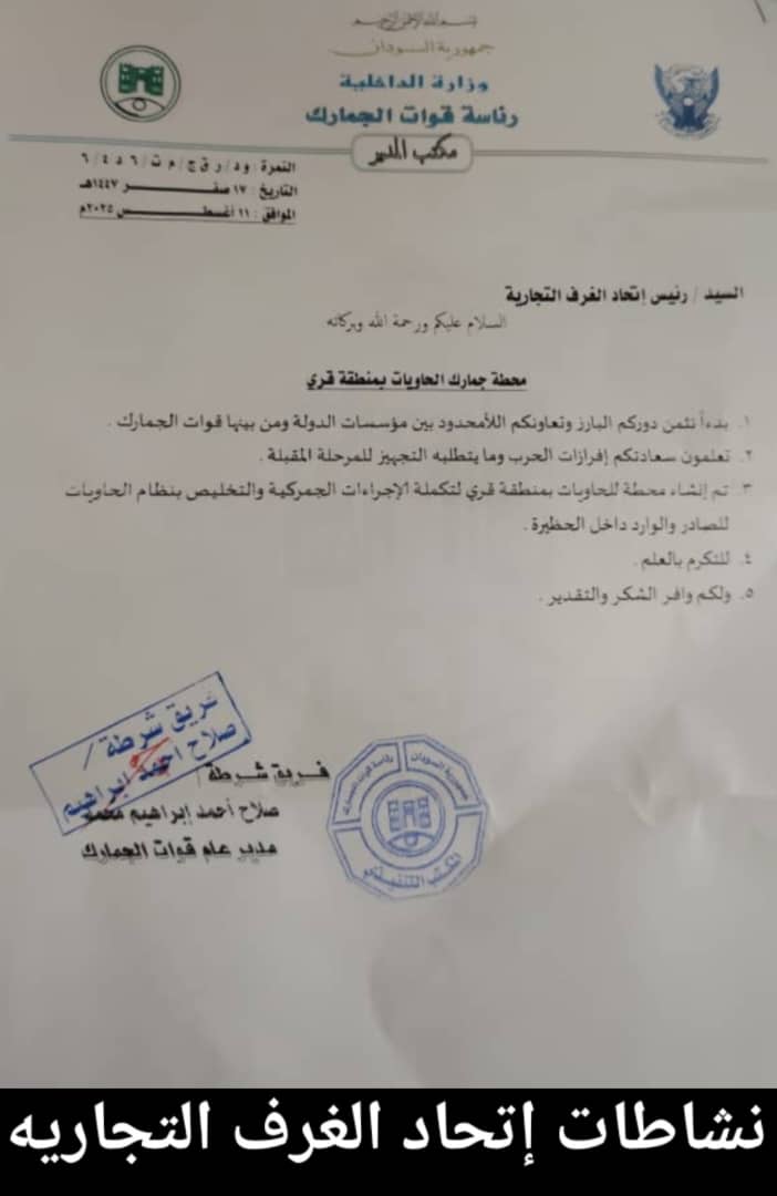 أعلن مدير قوات الجمارك الفريق شرطة صلاح أحمد ابراهيم عن إنشاء محطة للحاويات بمنطقة قري لتكملة الاجراءات الجمركية والتخليص بنظام الحاويات للصادر والوارد داخل الحظيرة.