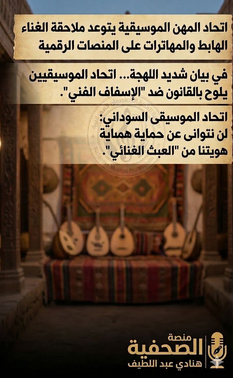 أصدر اتحاد المهن الموسيقية في السودان بياناً شديد اللهجة حذر فيه من تدهور بعض مظاهر الساحة الغنائية في الفترة الأخيرة، مؤكداً عزمه اتخاذ إجراءات قانونية وإدارية لضبط المهنة وحماية الإرث الفني السوداني مما وصفه بالإسفاف والمهاترات.
