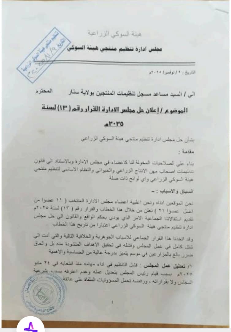 أعلن 11 عضوا من أصل 21 في مجلس إدارة تنظيم منتجي هيئة السوكي الزراعي بتاريخ 9 نوفمبر 2025م استقالتهم الجماعية، معلنين بذلك حل المجلس رسميا من خلال القرار رقم (13) لسنة 2025م، استنادا إلى الصلاحيات القانونية والنظام الأساسي المعمول به.