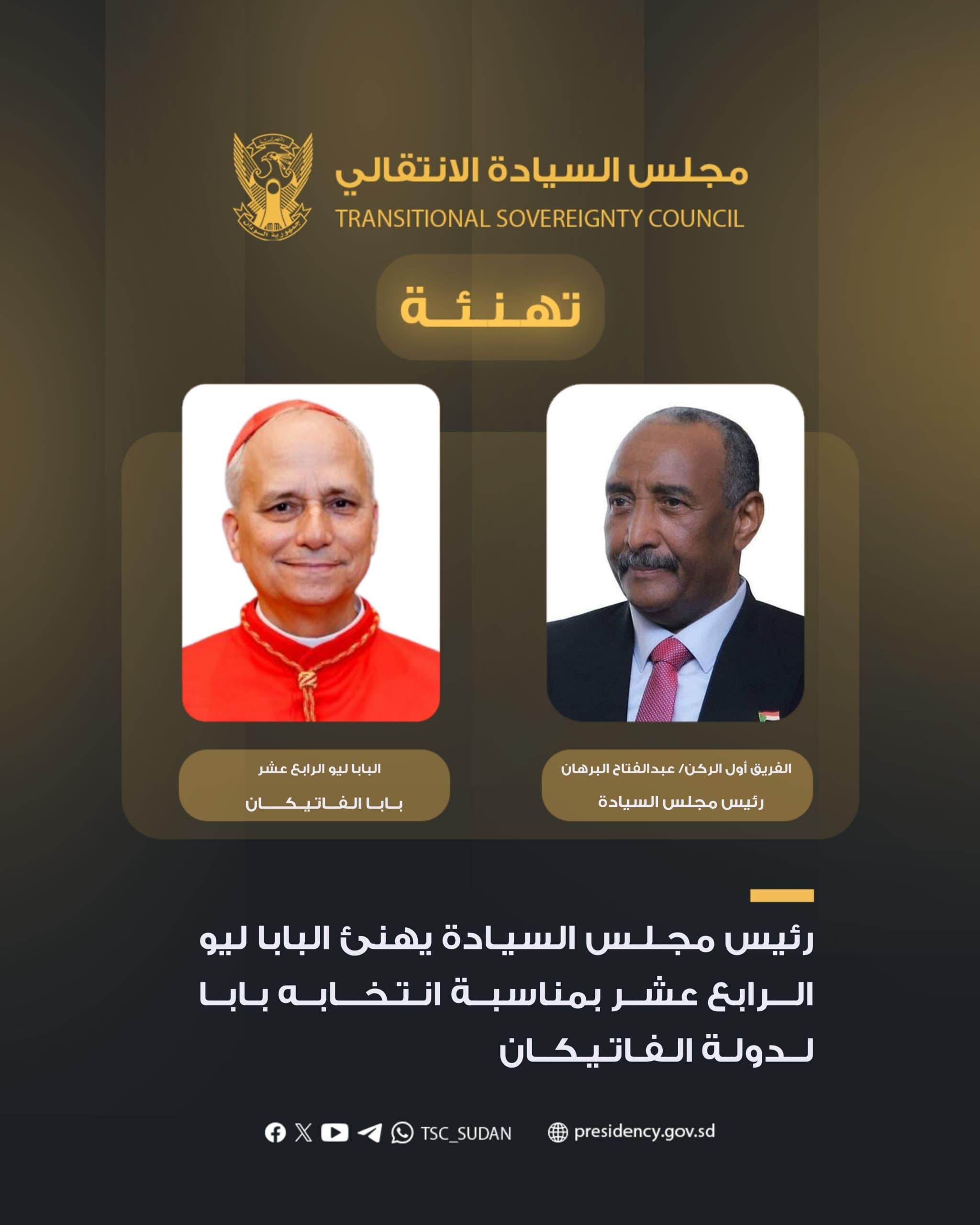 بعث رئيس مجلس السيادة الانتقالي القائد العام للقوات المسلحة الفريق أول الركن عبدالفتاح البرهان برقية تهنئة إلى قداسة البابا ليو الرابع عشر بمناسبة انتخابه بابا للفاتيكان.