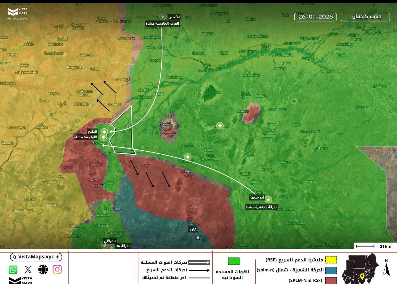 • عنصر المفاجأة: في 26 يناير 2026، باغتت قوات الجيش و”متحرك الصياد” والقوات المشتركة الحركات المتمردة داخل الدلنج، مما أدى إلى انهيار دفاعاتهم وفرارهم مخلفين وراءهم خسائر فادحة في العتاد والأرواح.