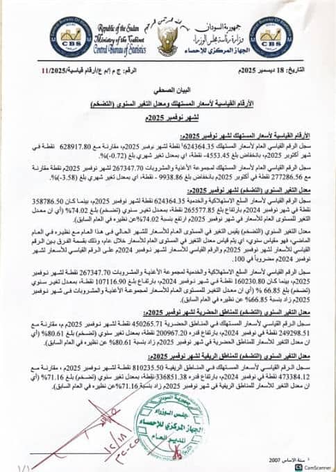 كشف الجهاز المركزي للاحصاء عن تراجع معدل التضخم لشهر نوفمبر 2025 إلى 74.02% مقارنة مع 77.40% معدل التضخم لشهر أكتوبر المنصرم.