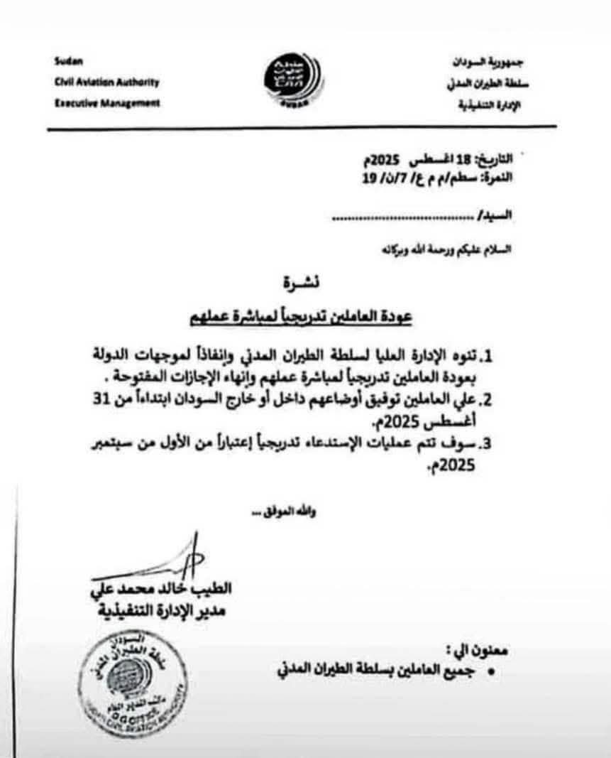 أصدرت سلطة الطيران المدني في السودان قرارا قضى بعودة العاملين تدريجياً اعتبارا من أول سبتمبر 2025م لمباشرة عملهم، إنفاذاً لموجهات الدولة بعودة العاملين تدريجياً لمزاولة أعمالهم وإنهاء الإجازات المفتوحة.