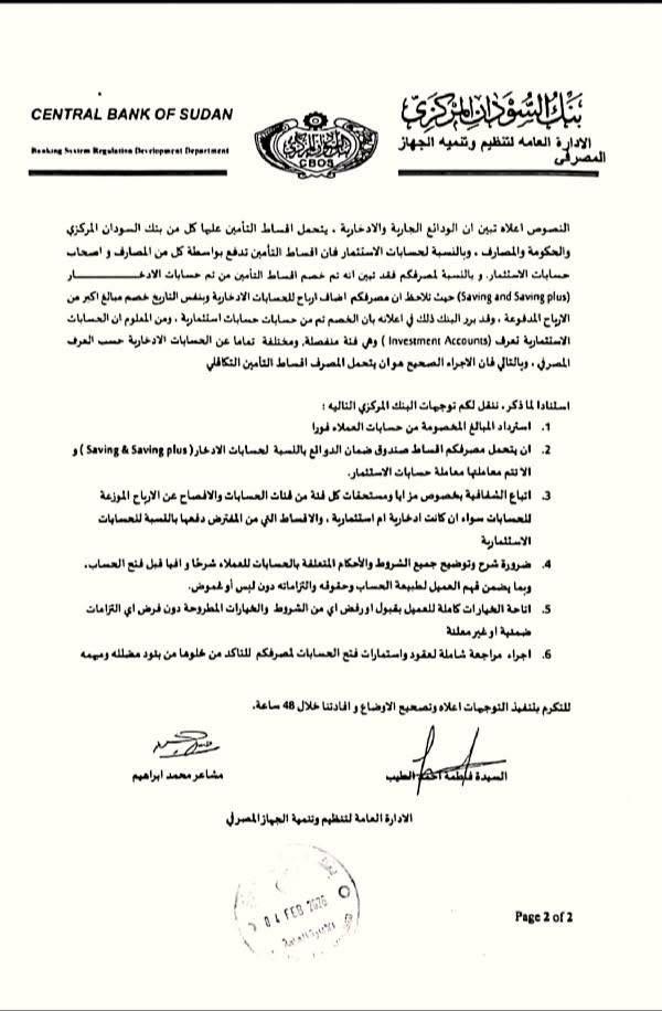 أصدر بنك السودان المركزي توجيهات إلى بنك الخرطوم تقضي بإيقاف خصم أي مبالغ مالية من حسابات العملاء تحت مسمى مساهمات أو رسوم صندوق ضمان الودائع، مع إلزامه بإعادة المبالغ التي تم استقطاعها سابقًا.