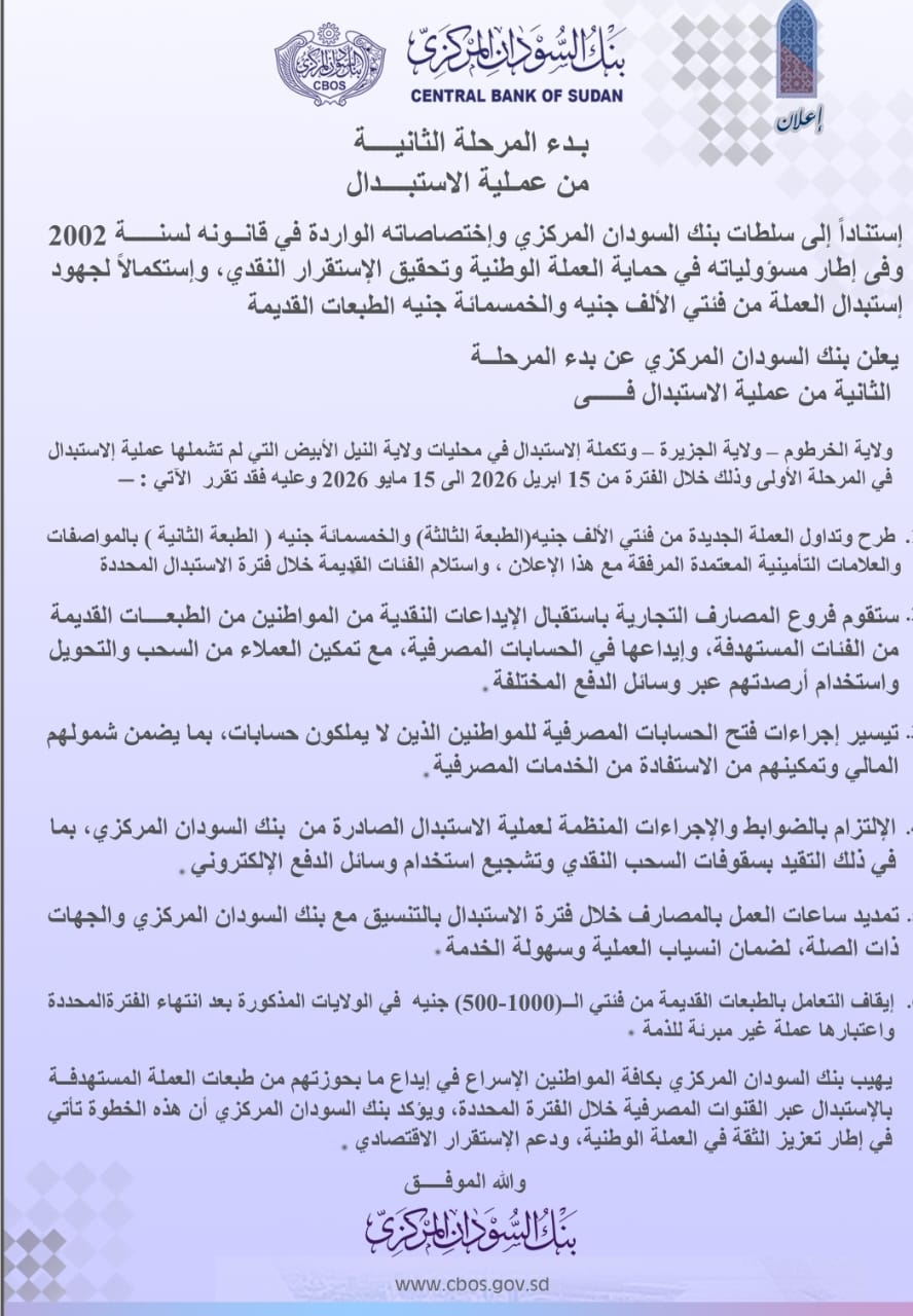 الأحداث – متابعات أعلن بنك السودان المركزي عن انطلاق المرحلة الثانية لاستبدال العملة بولاية الخرطوم والجزيرة وتكملة الاستبدال في محليات ولاية النيل الأبيض التي لم تشملها عملية الاستبدال المرحلة في الاولى ، اعتبارا من الأربعاء 15 أبريل إلى 15 مايو 2026.