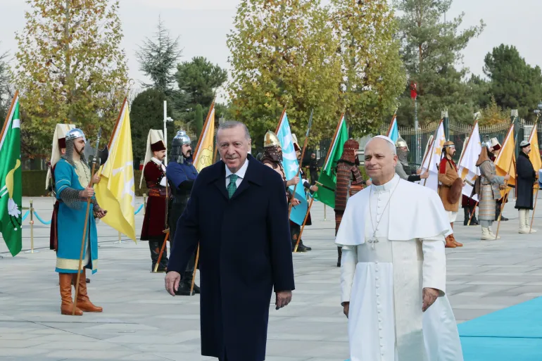 دعا البابا ليو الـ14، في أول زيارة خارجية له منذ تولّيه منصبه في مايو الماضي، تركيا إلى أن تكون عامل استقرار وتقارب بين الشعوب في مرحلة وصفها أنها تشهد صراعا قويا في العالم، محذرا، في الوقت ذاته، من “طغيان اللون الواحد”، وما قد يمثّله من إفقار للتنوع التركي.
