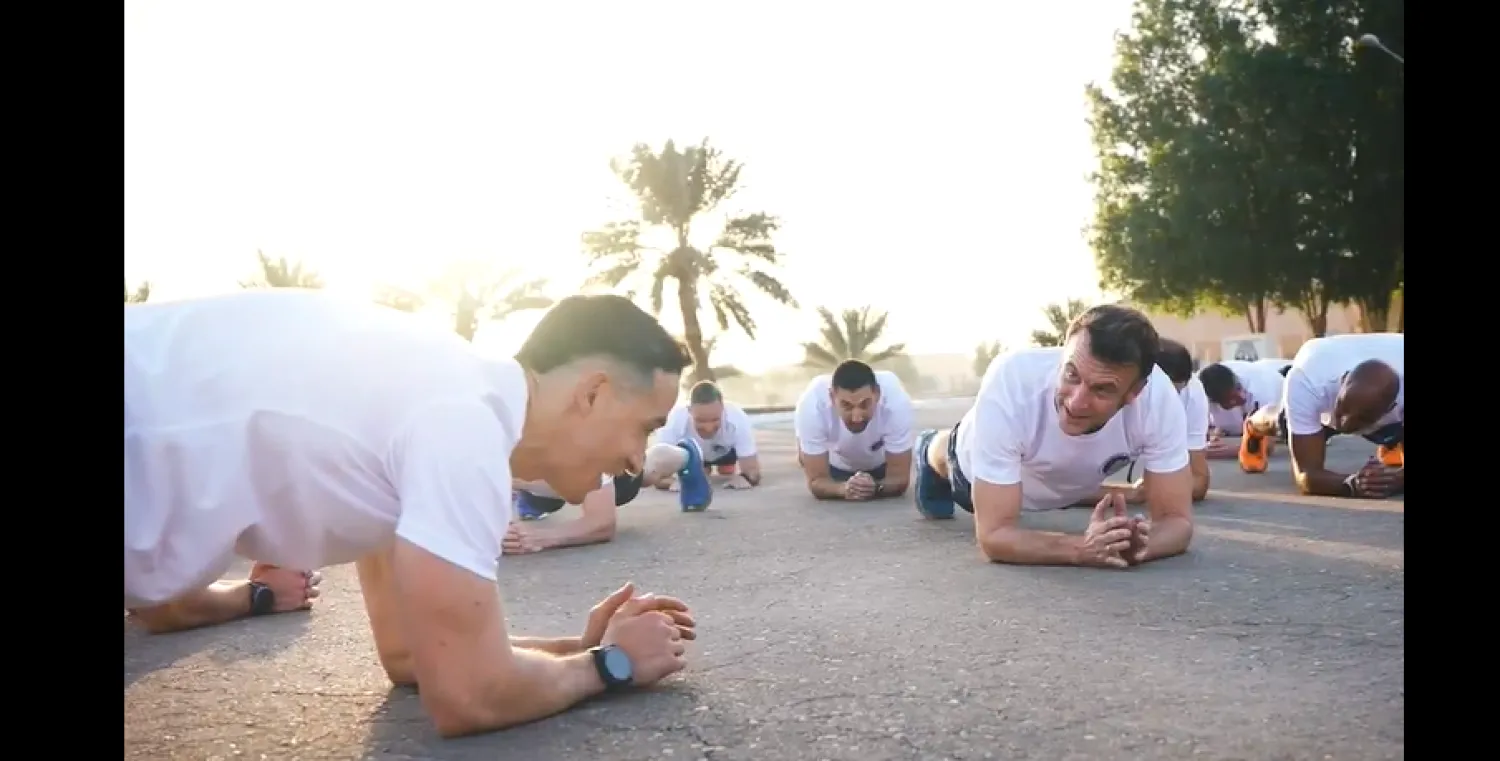 ففي مقطع فيديو نشره على منصات مواقع التواصل، ظهر ماكرون وهو يقوم بـ”تمارين الضغط العسكرية”، إلى جانب تمارين البلانك ورفع الركبة، أمام مركبة مدرعة، قبل أن ينطلق معهم في الجري وذلك خلال زيارة للقوات الفرنسية في أبوظبي يوم الأحد، الذي صادف عيد ميلاده الثامن والأربعين.