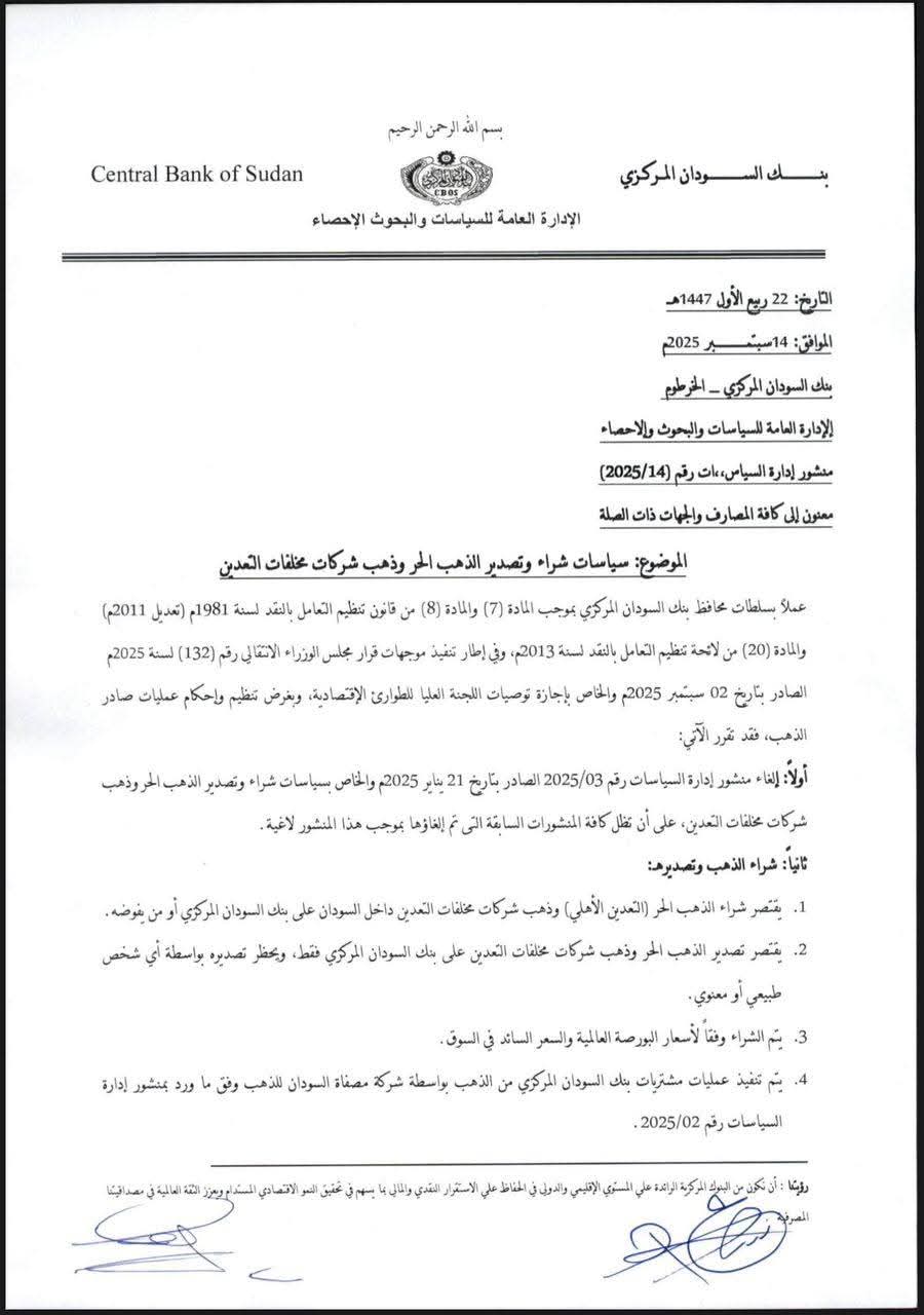 واقتصر في منشور عممه للمصارف (الأحد) حصلت عليه (الاحداث) شراء وتصدير الذهب الحر (التعدين الأهلي) وذهب شركات مخلفات التعدين داخل السودان على بنك السودان المركزي أو من يفوضه.