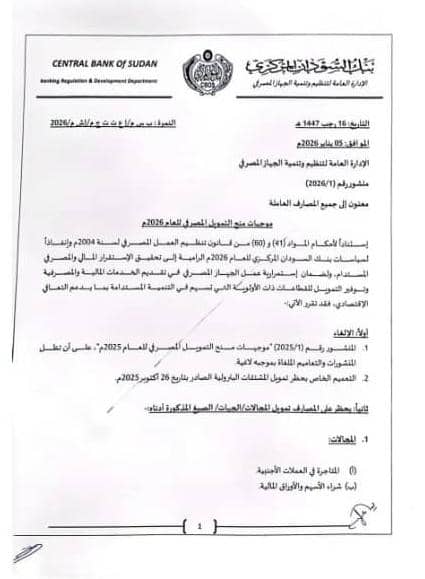 أصدر بنك السودان المركزي منشور موجهات منح التمويل المصرفي للعام 2026.