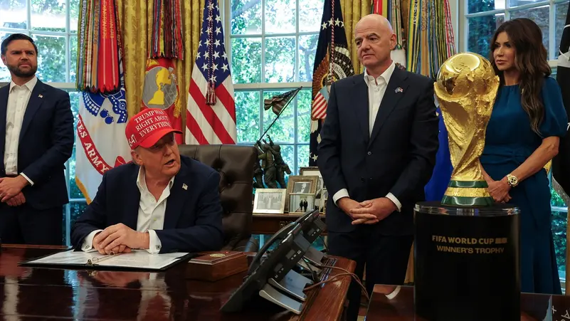 وقال ترامب، جالسا في المكتب البيضاوي إلى جانب رئيس الاتحاد الدولي للعبة (فيفا) السويسري جاني إنفانتينو، وهو يمسك كأس العالم بين يديه واضعا على رأسه قبعة حمراء تحمل الشعار: “ترامب كان محقا في كل شيء”؛ قال “من المحتمل أن يكون هذا أكبر حدث رياضي”.