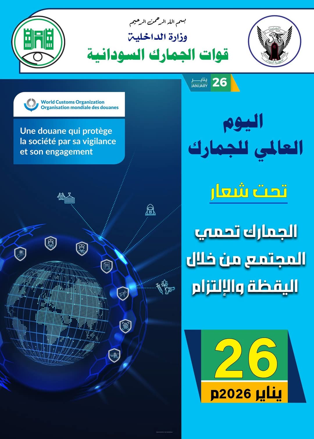 أعلنت قوات الجمارك السودانية استعدادها للاحتفال بيوم الجمارك العالمي الذي يصادف 26 يناير من كل عام، والذي يأتي هذا العام تحت شعار: