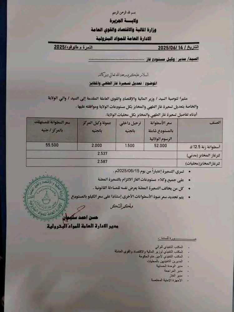 أعلنت ولاية الجزيرة عن تعديل جديد في أسعار الغاز .