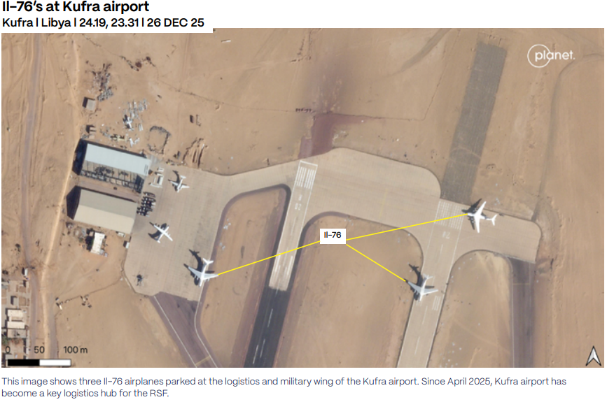 وبيّن التقرير أن ليبيا لم تعد مجرد ممر، بل أصبحت قاعدة عمليات ومركزاً لتجميع القوات وإعادة توزيعها، مشيراً إلى رصد قوافل عسكرية مشتركة ونقل مقاتلين أجانب لدعم الدعم السريع. كما وثّق زيادة كبيرة في رحلات الشحن إلى مدينة الكفرة منذ أبريل 2025، حيث سُجّل وصول 143 طائرة شحن من طراز Il-76 خلال تسعة أشهر، بمتوسط يقارب 16 طائرة شهرياً.