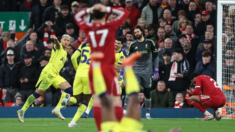 أضاع ليفربول فرصة العودة إلى المراكز الأربعة الأولى في الدوري الإنجليزي الممتاز، بعد أن سجل البرازيلي ريتشارليسون لاعب توتنهام هوتسبير هدفاً في الدقائق الأخيرة، لتنتهي المباراة بالتعادل 1-1 على ملعب أنفيلد يوم الأحد.