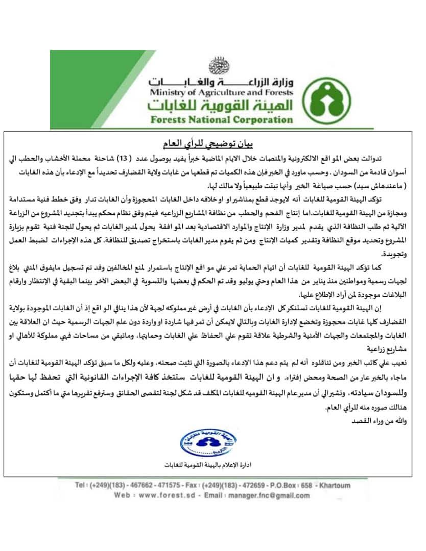 أصدرت الهيئة القومية للغابات بياناً استنكرت فيه ماراج من أخبار خلال الفترة الماضية بوصول شحنات من الحطب والخشب من منطقة القضارف إلى أسوان،