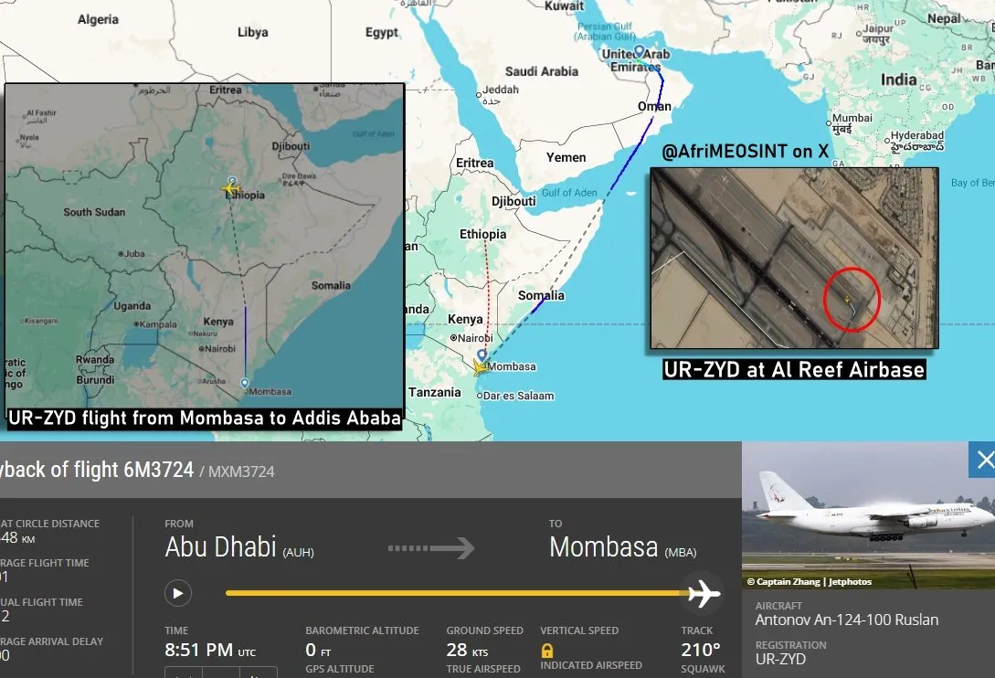 وتضم قائمة الرحلات أيضًا وصول طائرة شحن ثقيل واحدة على الأقل من طراز An-124-100 (التسجيل UR-ZYD)، تشغّلها شركة Maximus Air المرتبطة بالحكومة الإماراتية، حيث أقلعت من قاعدة الريف الجوية في أبوظبي إلى مومباسا في كينيا، ثم واصلت مباشرة إلى مطار بولي الدولي في أديس أبابا.