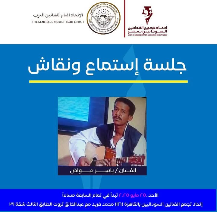 جلسة استماع مع إبن الشرق الفنان الشاب ياسر عواض، وتعتبر الجلسة المقامة الاحد القادم بدار الاتحاد، أحد الفعاليات الراتبة التي ينشط فيها الاتحاد.