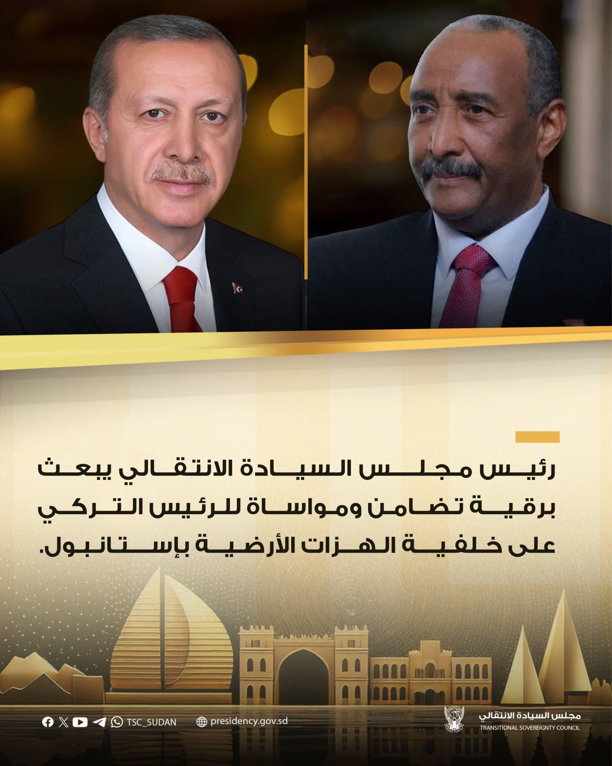 وعبر البرهان عن أمنياته بالسلامة لمواطني إستانبول وما حولها، وأضاف “قلوبنا معكم حتى تتجاوزوا هذه المحنة”.