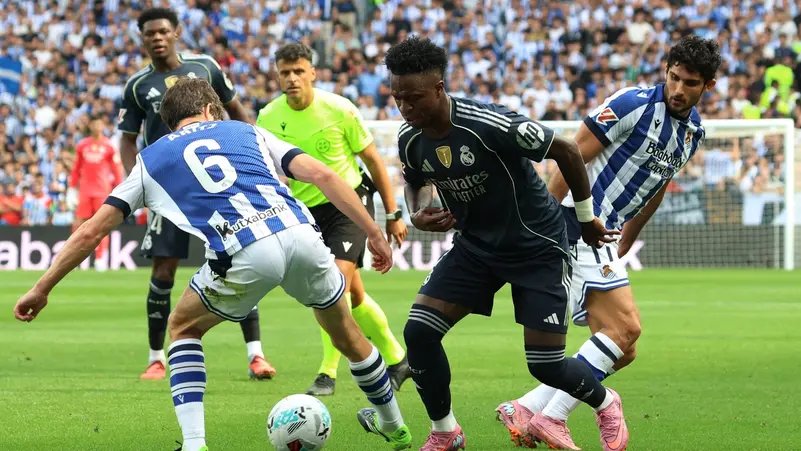 فاز ريال مدريد على مضيفه ريال سوسييداد 2 – 1 في الجولة الرابعة من الدوري الإسباني لكرة القدم وذلك رغم لعبه قرابة ساعة كاملة منقوصاً بعد طرد مدافعه دين هويسن خلال الشوط الأول.