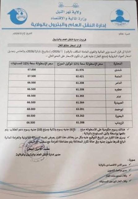 أعلنت إدارة النقل العام والبترول بولاية نهر النيل، عن تسعيرة جديدة لغاز الطبخ.