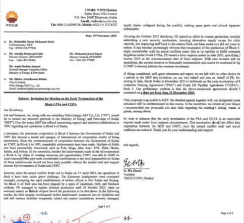 أبلغت شركة (CNPC) الصينية شركتها الفرعية “بترو إنرجي” ووزارة الطاقة والتعدين السودانية بأنها مضطرة لطلب اجتماع عاجل في جوبا خلال ديسمبر 2025 لمناقشة الإنهاء المبكر لعملها في مجال النفط في السودان.