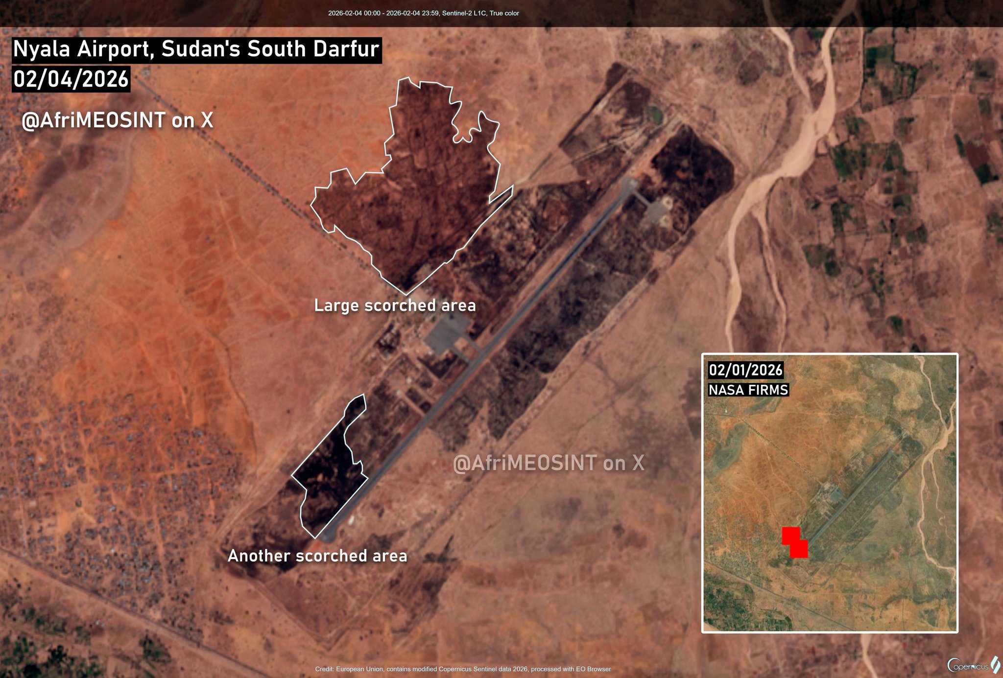 كشفت صور أقمار صناعية حديثة، التقطت بتاريخ 4 فبراير الحالي، عن وجود منطقتين محترقتين داخل وحول مطار نيالا الدولي في ولاية جنوب دارفور بالسودان، وفق تحليل أجراه الباحث المتخصص في مصادر الاستخبارات والأمن، ريش تييد.