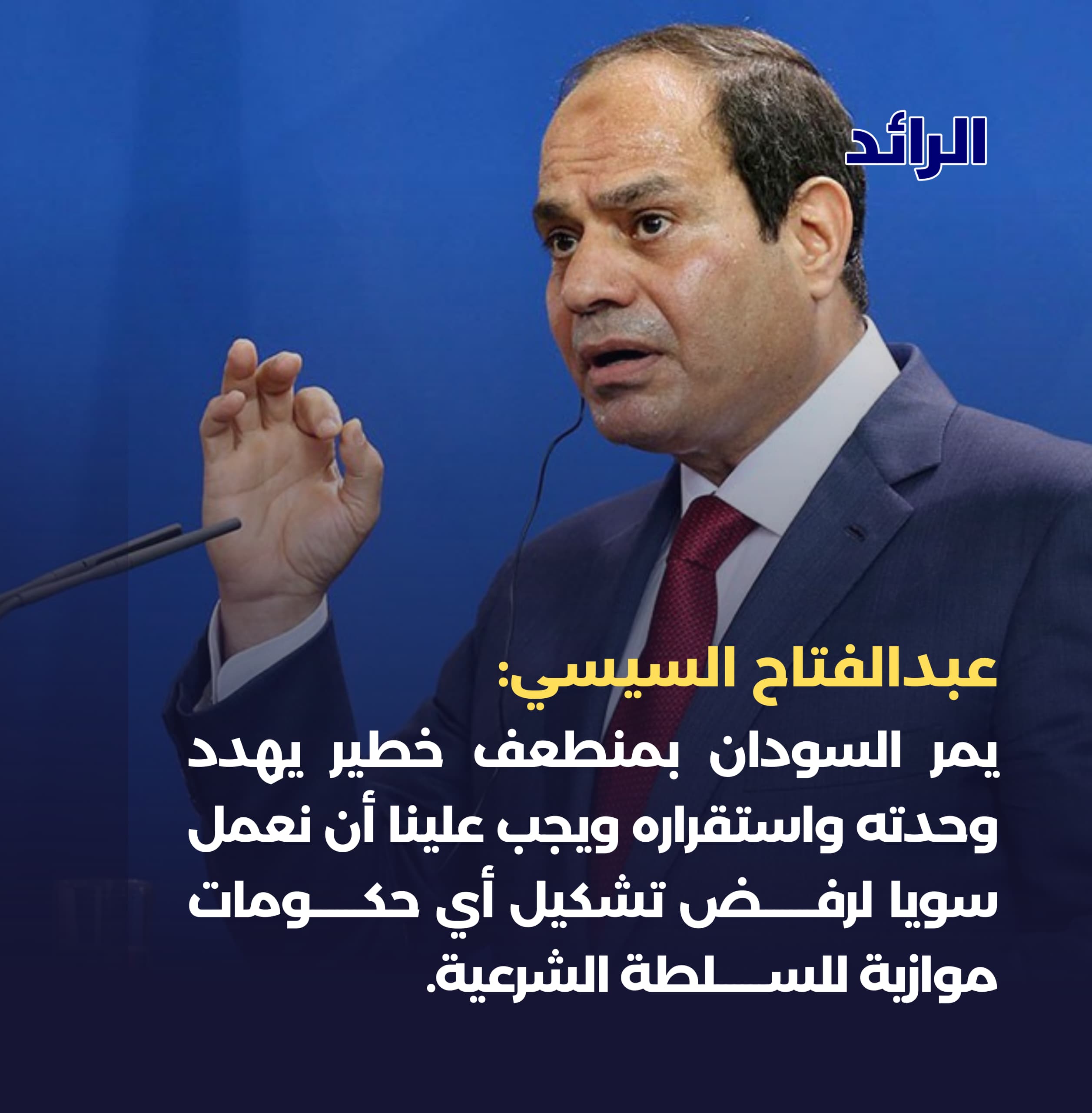 الرئيس المصري عبدالفتاح السيسي: يمر السودان بمنطعف خطير يهدد وحدته واستقراره ويجب علينا أن نعمل سويا لرفض تشكيل أي حكومات موازية للسلطة الشرعية.