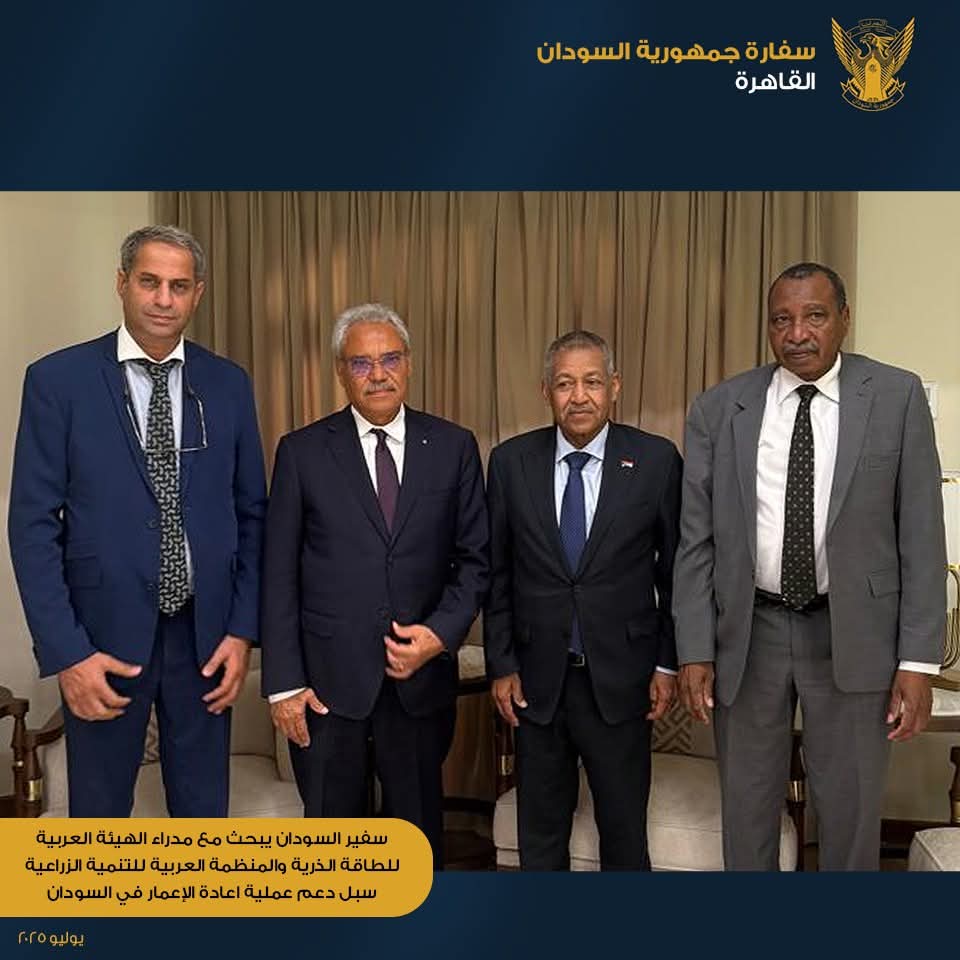 وأكد السفير تطلع السودان إلى انخراط أكبر من المنظمات العربية المتخصصة في جهود إعادة الإعمار، معربا عن تقديره للدور الفاعل الذي تقوم به منظمتي التنمية الزراعية والطاقة الذرية في دعم مساعي تعزيز العمل العربي المشترك وإحداث نقلة نوعية في مجالات الطاقة السلمية والتنمية الزراعية.