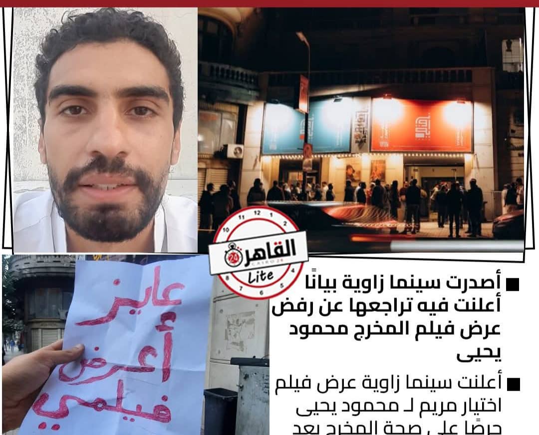 أطلقت إدارة سينما زاوية بالقاهرة بيانا تعلن فيه عرض فيلم المخرج محمود يحي انقاذا لحياته بعد اضرابه عن الطعام بسبب عدم عرض الفيلم ،وقال البيان: “تابعنا موقف المخرج محمود يحيى واستمراره في الإضراب عن الطعام مطالباً بعرض فيلمه في سينما زاوية.بعد إصرار المخرج لأشهر على إدراج فيلمه ضمن برنامج زاوية، تواصلنا مع شركة توزيع الفيلم واقترحنا عليها تقديم عرض في زاوية من تنظيمها وهو ما رفضه المخرج. أبلغتنا شركة توزيع الفيلم برفض دور العرض الأخرى تقديمه، وبناءً على ذلك قررنا عرضه في زاوية حرصاً على صحة المخرج وحياته لا لأي سبب آخر، مع التأكيد على أن توفير فرصة العرض التجاري هي مسؤولية الموزع لا دار العرض.