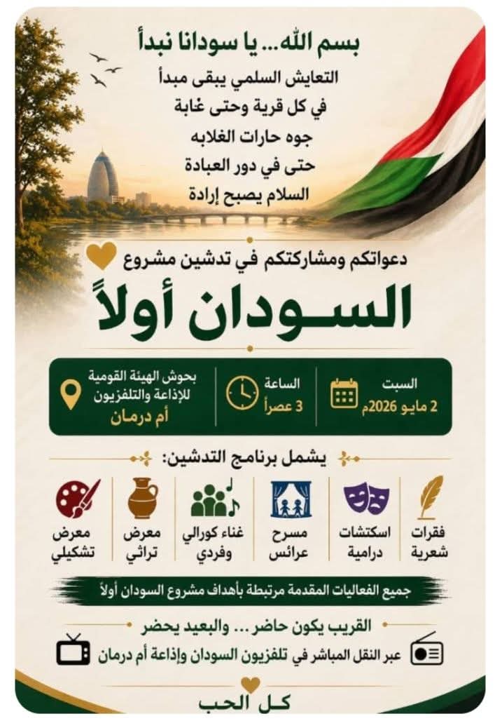 أُعلن مصطفى علي جوبا عضو اتحاد الغناء والموسيقى السوداني عن إطلاق مشروع وطني جديد تحت مسمى “السودان أولاً”، ، وذلك بهدف تعزيز قيم الوحدة والسلام بين مكونات المجتمع السوداني.