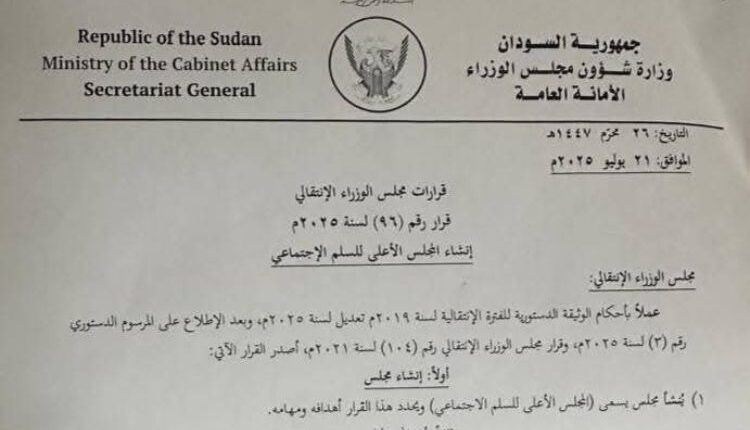 أصدر رئيس الوزراء د.كامل إدريس قرارا بإنشاء المجلس الأعلى للسلم الاجتماعي برئاسة النور الشيخ النور الشيخ وإسحق ميرغني الشيخ حمد النيل نائبا له، وعاليا حسن أبونا أمينا عاما، على أن يتم استكمال عضوية المجلس وفقا للآليات التي تضمن تمثيلا للفعاليات المعززة للسلم الاجتماعي.