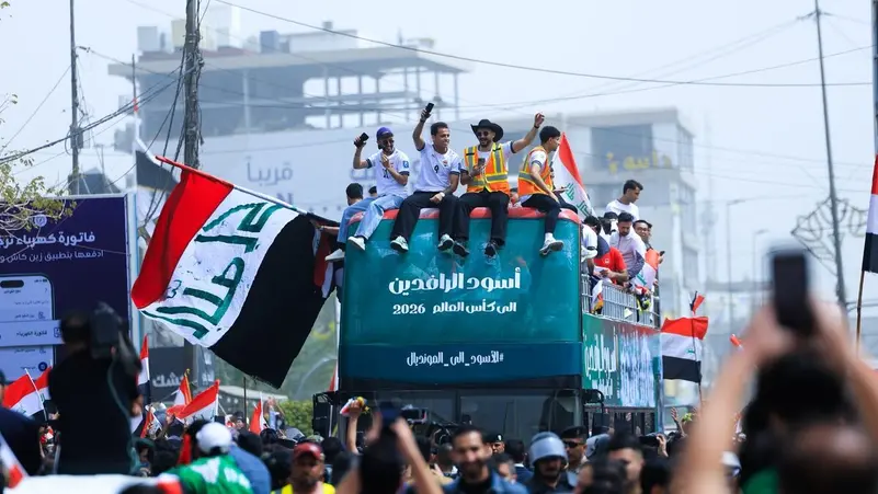 لاعبو العراق يجوبون شوارع بغداد بحافلة مكشوفة احتفالاً بالتأهل لكأس العالم