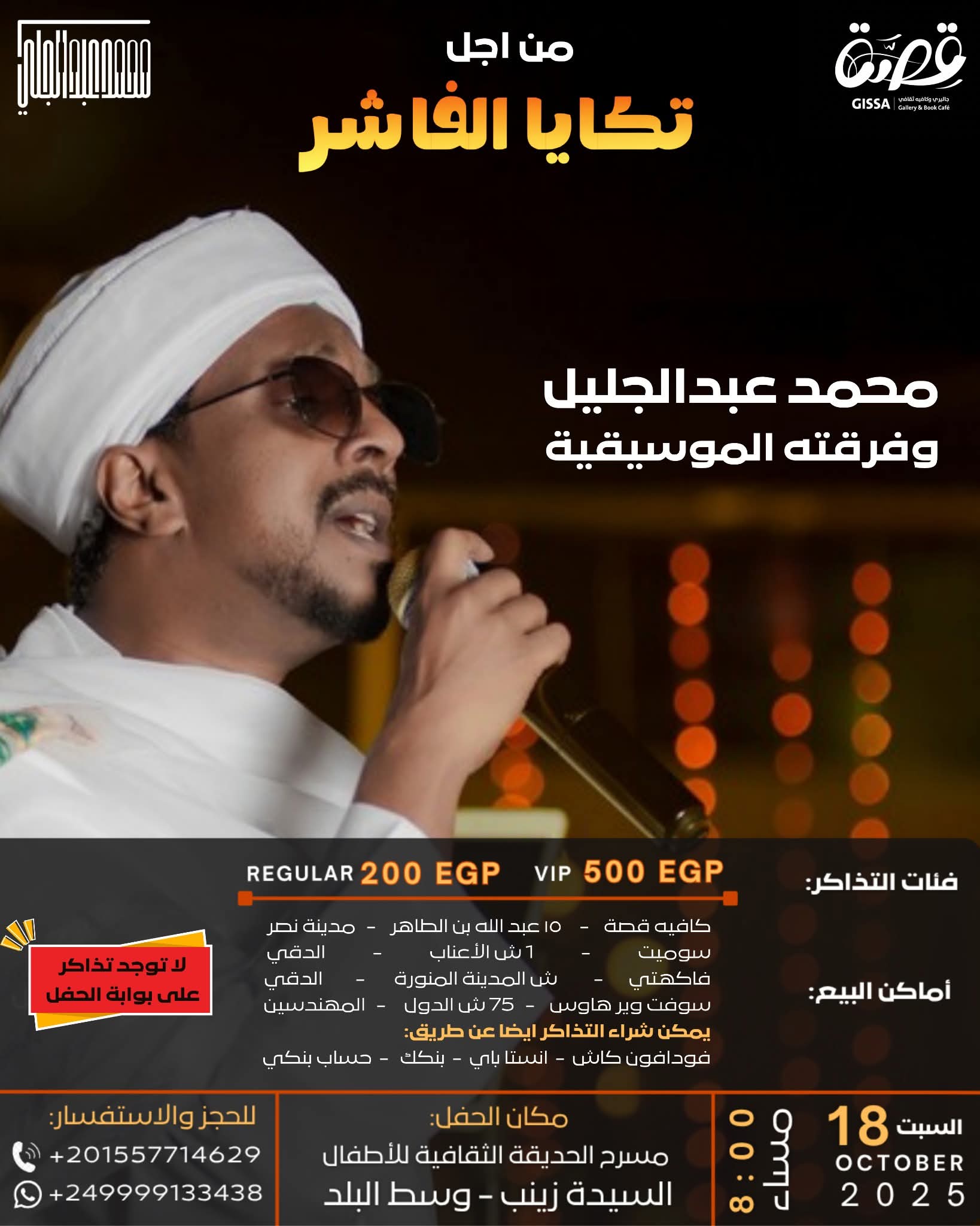 وأضاف “يا أهل السودان، هل نترك الفاشر وحدها في ظلام هذا الليل؟ هل نقف مكتوفي الأيدي وأبناء وطننا يصارعون الموت من أجل كسرة خبز؟ نحن اليوم أمام اختبار الإنسانية والكرامة، فلنجعل تكاتفنا رسالة حياة ودفء وقوة، ولنجعل حفلنا هذا بارقة أمل لأهلنا المحاصرين، صوتاً يعلو على كل صمت ويوقد شمعة في عتمة الأيام. تعالوا جميعاً، يوم السبت 18 أكتوبر 2025، الساعة الثامنة مساءً، بمسرح الحديقة الثقافية للاطفال، ش. قدري بالسيدة زينب. فكل تذكرة تشتريها هي نبض حياة، وكل مشاركة منك تعني أنك تمد يدك إلى طفل جائع وتربت على قلب أم تحتضر بالهم والخوف.الفاشر وطننا، وجراح أهلها جراحنا، ودعوتي لكم أن نتحد ونرسم للعالم صورة السودان الكبير بقلبه وصموده… فالأمل يولد حين نتكاتف، والحياة تعود حين نختار أن نكون سنداً لبعضنا البعض”.
