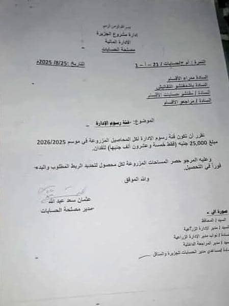 فرضت إدارة مشروع الجزيرة رسوما جديدة على المزارعين لنقل المحاصيل المزروعة لموسم 2025_2026 بواقع 25.000 للفدان وفقا لخطاب حصلت (الاحداث) على نسخة منه .
