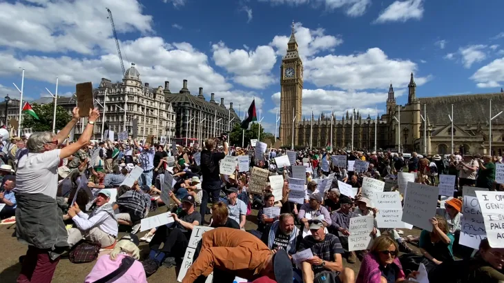 وتدخلت شرطة لندن لفض المظاهرة التي نُظمت وسط العاصمة، وحمل متظاهرون لافتات كتبوا عليها عبارة “أنا ضد الإبادة الجماعية، وأدعم فلسطين أكشن”.