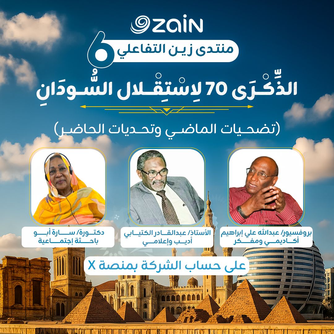 احتفى منتدى زين التفاعلي في انعقاده السادس بالذكرى السبعين لاستقلال السودان المجيد، بجلسة حوار تحت عنوان “تضحيات الماضي وتحديات الحاضر”، وذلك في لقاء افتراضي نُظّم مساء الأول من يناير 2026 عبر منصة X (تويتر سابقًا).