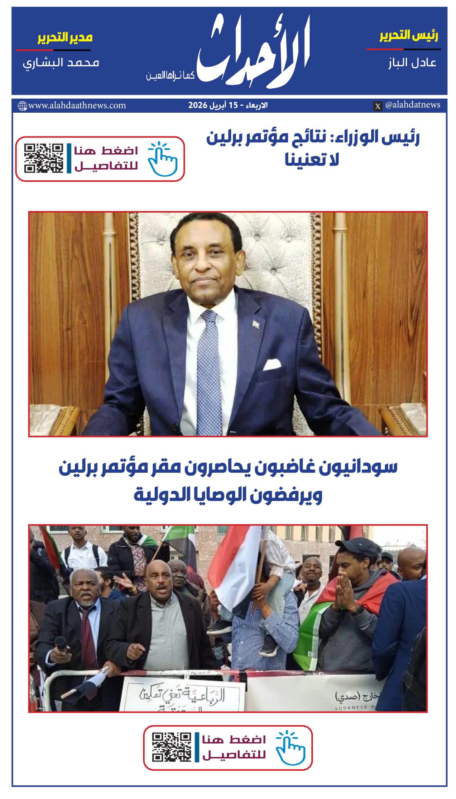 موجز عناويين نشرة الأحداث المسائية 15 أبريل 2026 Munzir https://alahdaathnews.com/wp-content/uploads/2026/04/WhatsApp-Video-2026-04-15-at-11.25.30-PM.mp4?_=1 مقالات ذات صلة موجز عناويين جريدة الأحداث 15 أبريل 2026 موجز عناويين نشرة الأحداث المسائية 14 أبريل 2026 موجز عناويين جريدة الأحداث 14 أبريل 2026