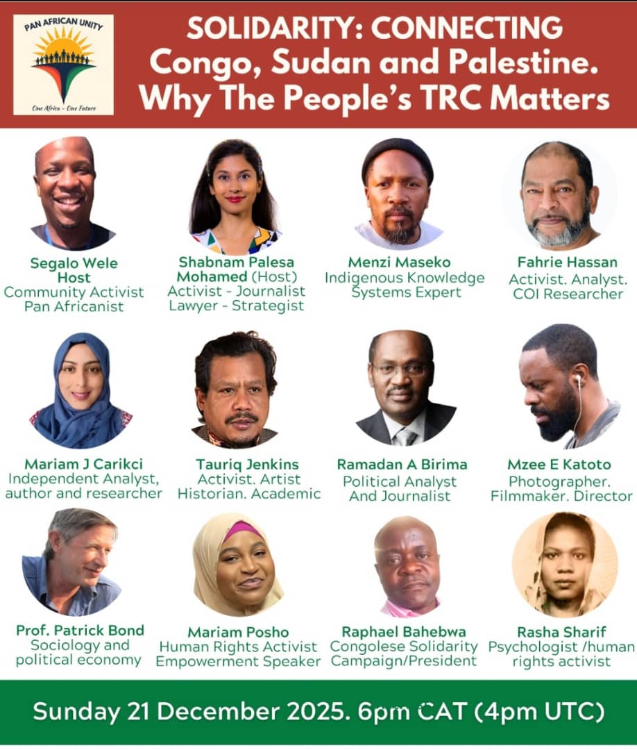 خاطب عدد كبير من نشطاء حقوق الإنسان وأساتذة جامعات من جنوب أفريقيا وخارجها مساء (الأحد) ندوة اسفيرية تضامنية نظمتها “لجنة الحقيقة والمصالحة الشعبية” المعروفة اختصاراً باسم People’s TRC تحدث فيها 12 ناشطاً وباحثاً من بينهم رمضان أحمد، المحلل السياسي ومساعد رئيس التحرير في موقع “سودان هواريزون” الإخباري، وكان موضوع الندوة الاسفيرية هو “التضامن مع أهل فلسطين والسودان والكنغو بهدف فضح ممارسات القوى الإمبريالية وأطماعها في الموارد والأرض”.