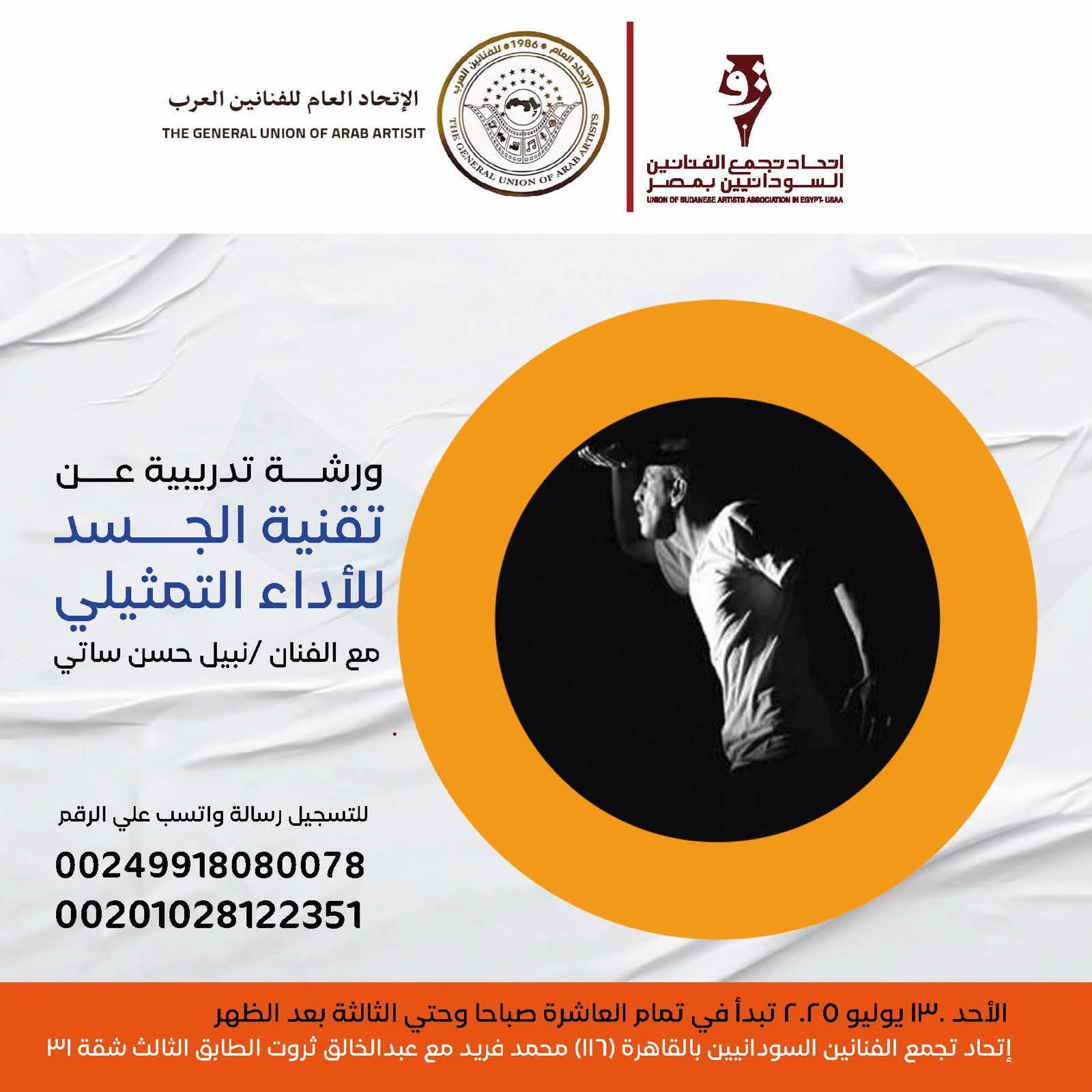 ينظم تجمع اتحاد الفنانين السودانيين بمصر ورشة ليوم واحد- مع الفنان والمخرج نبيل حسن ساتي- بعنوان ورشة تقنية الجسد .