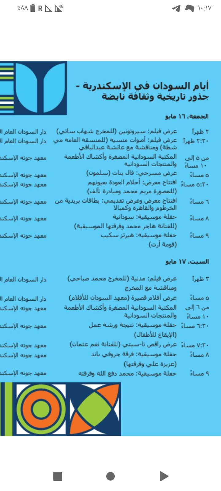 يستضيف معهدا جوته الإسكندرية والسودان بالتعاون مع دار السودان العام بالإسكندرية فعالية تستمر لمدة 3 أيام لتسليط الضوء على الثقافة السودانية في الإسكندرية وما حولها.